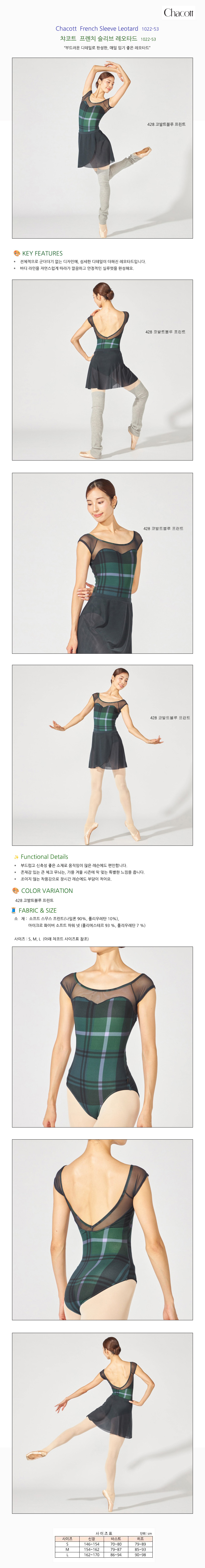 Chacott French Sleeve Leotard 1022-53 체크 프린트의 클래식한 레오타드 부드러운 프린트 원단에 튤 스커트가 우아한 디자인 KEY FEATURES - 체크무늬 프린트가 들어간, 부드럽고 여성스러운 레오타드입니다. - 튤 스커트가 부착되어 있어 단독으로도 착용이 가능한 디자인입니다. Functional Details - 가슴선 아래의 절개선으로 슬림한 실루엣을 연출합니다. - 넓게 파인 등 라인으로 우아한 뒷모습이 돋보이는 디자인입니다. - 프렌치 슬리브 디자인으로 어깨를 부드럽게 감싸주며 활동성이 좋습니다. COLOR VARIATION - 그린 체크 FABRIC & SIZE - 부드러운 스트레치 프린트 원단 사용, 신축성이 뛰어남 - 메쉬/튤 소재 배색으로 가볍고 여성스러운 느낌 사이즈: S, M, L 사이즈표 - S : 바스트 74~82 / 웨스트 56~62 / 힙 79~87 - M : 바스트 79~87 / 웨스트 61~67 / 힙 84~92 - L : 바스트 86~94 / 웨스트 66~72 / 힙 89~97 세탁 방법 NO_TEXT