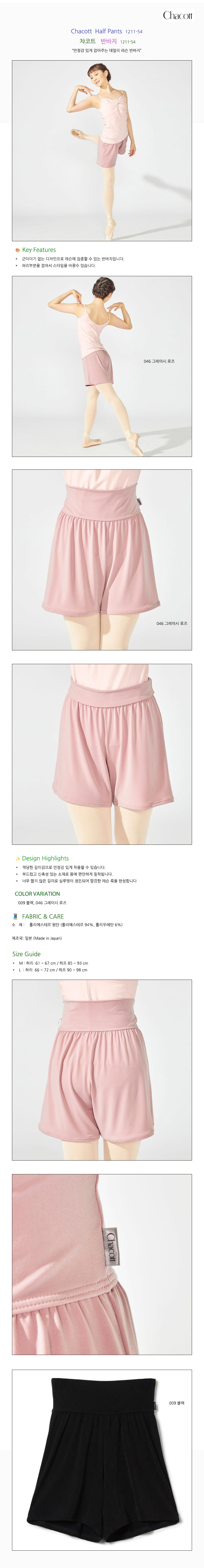 Chacott Half Pants 1211-54 치수는 비슷한 1211-48 소재는 비슷한 1211-48 Key Features - 부드러운 핏감으로 편안한 착용감을 선사하는 반바지 - 허리부분 밴드디테일을 넣어 복부를 편안하게 감싸줌 Design Highlights - 발레 및 다양한 움직임에 적합하게 설계된 숏 팬츠입니다. - 신축성 있는 소재로 활동성을 높였습니다. - 허리 밴드가 넓어 안정감 있게 착용할 수 있습니다. - 밑단이 자연스럽게 떨어져 편안한 실루엣을 연출합니다. COLOR VARIATION pink (01) / black FABRIC & CARE 소재: 폴리에스터 94%, 스판덱스 6% (추정, 이미지상 표기 흐림) 제조: 일본 / Made in Japan Size Guide - M: 허리 61~67 cm / 힙 85~93 cm / 총장 31 cm - L: 허리 65~73 cm / 힙 87~95 cm / 총장 34 cm