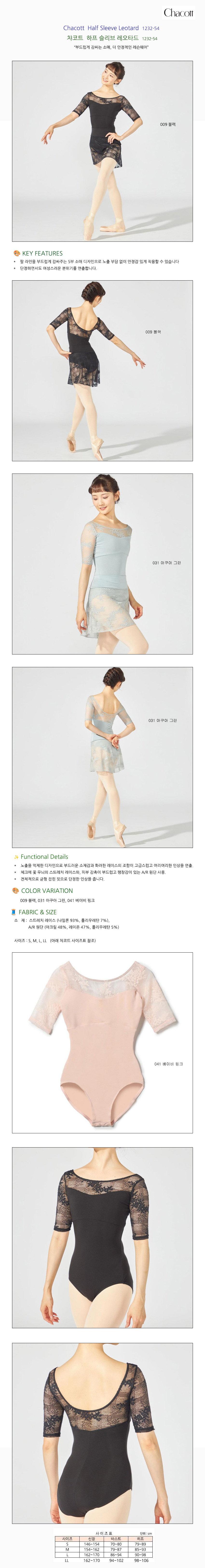 상품명: 챠코트 하프 슬리브 레오타드 1232-54 KEY FEATURES - 꽃무늬의 부드러운 레이스가 넥라인과 소매 부분에 우아한 분위기를 연출해 줍니다. - 가슴라인을 부드럽게 감싸주는 디자인입니다. 기능적 특징 - 쇄골을 예쁘게 보여주는 넓은 보트넥 라인으로 목선이 길어 보이고 우아하고 여성스러운 실루엣을 연출합니다. - 등 라인이 깊게 파여 있어 뒷모습도 아름답고, 가볍고 부드러운 착용감이 특징입니다. COLOR VARIATION - 009 블랙 - 031 스카이 그린 - 041 베이비 핑크 FABRIC & SIZE - 소재: 소프트 베어 텐션, 스트레치 레이스 - 혼용률: 나일론 80%, 폴리우레탄 20% - 사이즈: S, M, L 사이즈표 - S: 바스트 74~82 / 힙 82~90 / 신장 146~154 - M: 바스트 79~87 / 힙 87~95 / 신장 154~162 - L: 바스트 86~94 / 힙 92~100 / 신장 162~170 세탁 방법 - 이미지 내 확인 불가