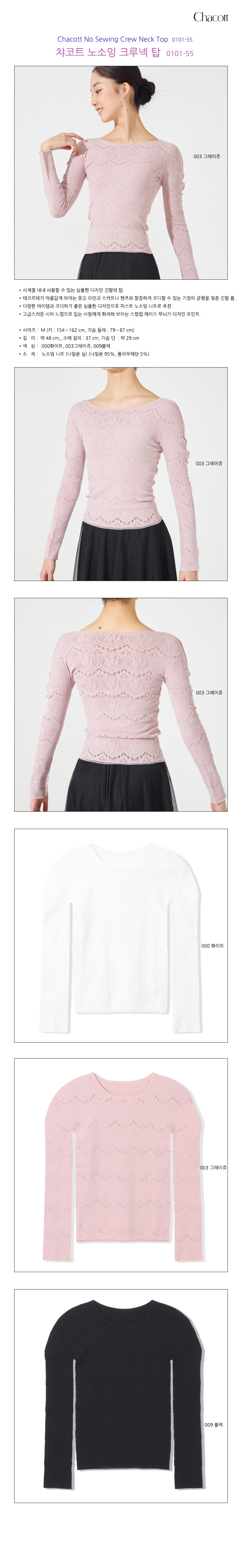 Chacott No Sewing Crew Neck Top 0101-55 차코트 노소잉 크루넥 탑 0101-55 - 시접선 부분 사용을 수 있는 입체를 담고한 제품 - 얇게 짜여진 레이스가 아닌 꽃잎 모양의 자카드가 스페셜한 느낌을 더해 개인을 살려 기장에 맞춰진 넥과 긴팔 소매 - 다양한 액티브나 크롭기 좋은 소프트한 디자인으로 미니 드레스나 팬츠와도 추천 - 크루넥라인이 여성스러운 실루엣을 유지해 주는 슬리브리스나 나시나 디테일 포인트 - 사이즈 : M / 41-15~16.2 cm, 가슴 64~79.8 / cm - 길이 : 약 44 cm, 소매 길이 : 37 cm, 가슴둘레 : 52.9 cm - 색상 : 000화이트, 003그레이쉬, 009블랙 - 소재 : 노소잉 니트(나일론 95%, 폴리우레탄 5%) 003 그레이쉬 000 화이트 003 그레이쉬 009 블랙