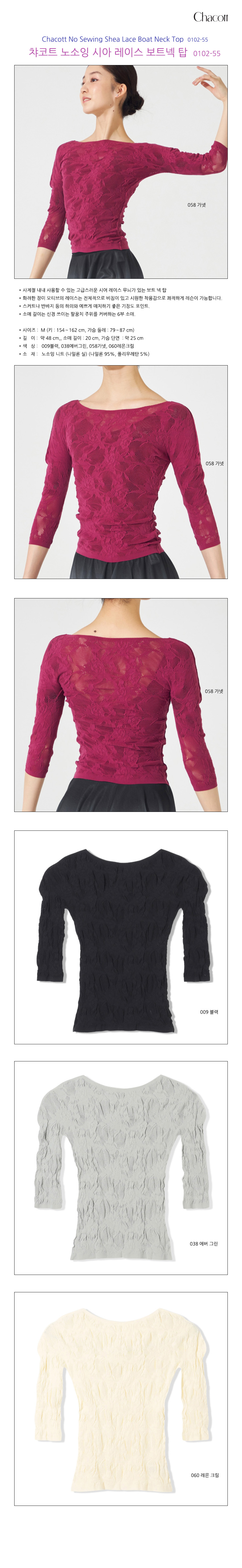 Chacott No Sewing Shea Lace Boat Neck Top 0102-55 차코트 노소잉 시아 레이스 보트넥 탑 0102-55 ・시접선 부분 사용을 수 있는 고급스러운 시어 레이스 무늬가 있는 탑 ・착용감 없이 편안하게 입는 노소잉 제품으로 바디 라인의 실루엣이 부드럽게 표현되기 좋습니다. ・노소잉 니트에서 보기 힘든 얇은 레이스가 포인트인 탑. ・길이감이 있는 8부 소매가 커버하기에도 좋습니다. ・사이즈:M ・신장:154~162cm, 가슴 둘레:79~87cm ・총장:약 44cm, 소매길이:20cm, 가슴둘레:약 25cm ・색상:058 가넷, 009 블랙, 038 미스트 그레이, 040 애프리콧 크림 ・소재:노소잉 니트(나일론 95%, 폴리우레탄 5%) 058 가넷 009 블랙 038 미스트 그레이 040 애프리콧 크림