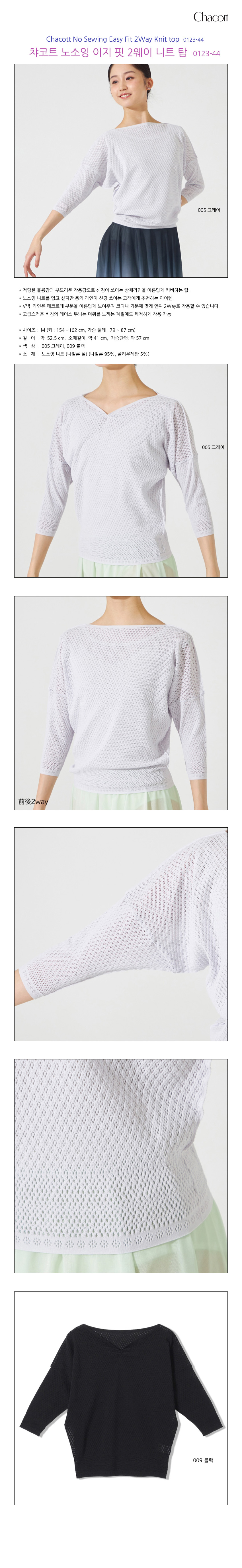 차코트 노소잉 이지 핏 2웨이 니트 탑 0123-44 ● 적당한 통풍감과 부드러운 착용감으로 신경이 쓰이는 상체라인을 아름답게 커버해줍니다. ● V넥이나 보트넥 2way 사양으로 입을 수 있어 코디하기 좋은 아이템입니다. ● 4부 길이의 소매로 사계절 이용하기 좋으며 코디나 기온에 맞게 입기 좋습니다. ● 댄스스러운 분위기의 시원한 느낌이 드는 니트 소재로 레슨이나 무대에서 착용 가능. サイズ:M Mサイズ:身丈 51.5~16.2 cm、裄丈 64.1~79.8 cm モデル:身長 162.5 cm、B 82 cm、W 64 cm、H 87 cm 着用サイズ:M カラー:005 ライラック、009 ブラック 素材:ポリエステル 95%、ポリウレタン 5% 前後2way