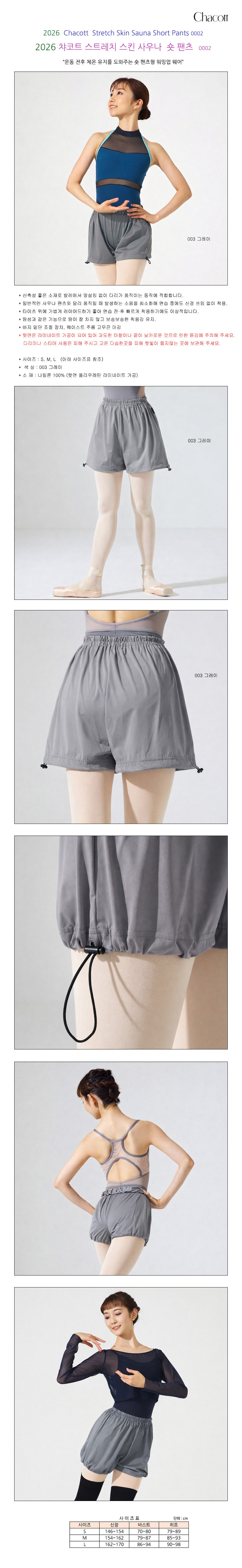 2026 Chacott Stretch Skin Sauna Short Pants 0002 2026 차콧 스트레치 스킨 사우나 숏팬츠 0002 “끈으로 길이와 핏을 자유롭게 조절할 수 있어요!” - 발목을 짧은 쇼츠로 활용할 수 있게 길이감이 짧아진 숏사우나 팬츠입니다. - 밑단은 스트링이 들어가 길이감 및 밑단의 실루엣을 조절하여 연출할 수 있고 짧고 귀여운 느낌이 강조된 아이템입니다. - 안으로 들어간 밑단의 고무밴딩이 땀의 증발을 막고 효과적인 움직임에 신경썼습니다. - 운동할 때뿐 아니라 일상복으로도 활용도가 높아 추천드려요. - UV 차단 효과, 흡수속건, 스트레치 기능이 있습니다. - Y존이 신경 쓰이지 않도록 앞판에 덧댐이 되어 있습니다. - Chacott의 사우나 제품은 땀 배출을 돕는 원단으로 제작되어 운동 후 땀이 잘 마르며, 가볍고 부드러운 착용감이 특징입니다. - 사이즈: S, M, L (M 사이즈 기준) - 색상: 003 그레이 - 소재: 나일론 100% (안감 폴리에스터 메쉬) 사이즈표 사이즈 / 신장 / 허리 / 힙 S / 145~154 / 70~80 / 78~89 M / 154~162 / 79~87 / 85~93 L / 162~170 / 86~91 / 90~98