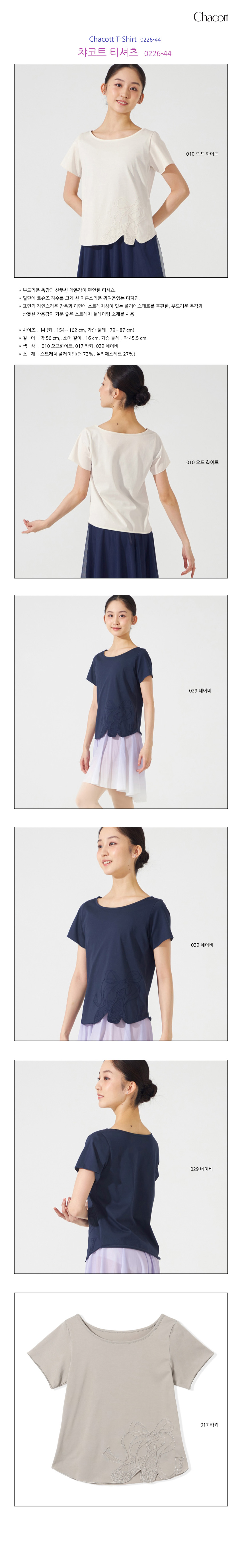 Chacott T-Shirt 0226-44 자코트 티셔츠 0226-44 * 자수로 춤추고 있는듯한 움직임이 포인트입니다. * 밑단에 하늘거리는 자수와 같이 입으시는거에 따라 달라져, 발레의 자연스러운 흐름과 움직임을 스커트와의 코디네이트로 소프트한 색감과 스타일링 하실수 있는 컷소재의 고급성이 느껴짐. * 사이즈 : M(신장 154~162 cm, 가슴 79~87 cm) * 길이 : 약 56cm, 소매 길이 : 16cm, 가슴둘레 : 약 45.5cm * 색상 : 010 오프 화이트, 029 네이비, 017 카키 * 소재 : 스모크기모레이온 73%, 폴리우레탄 27% c010 오프 화이트 019 오프 화이트 029 네이비 017 카키