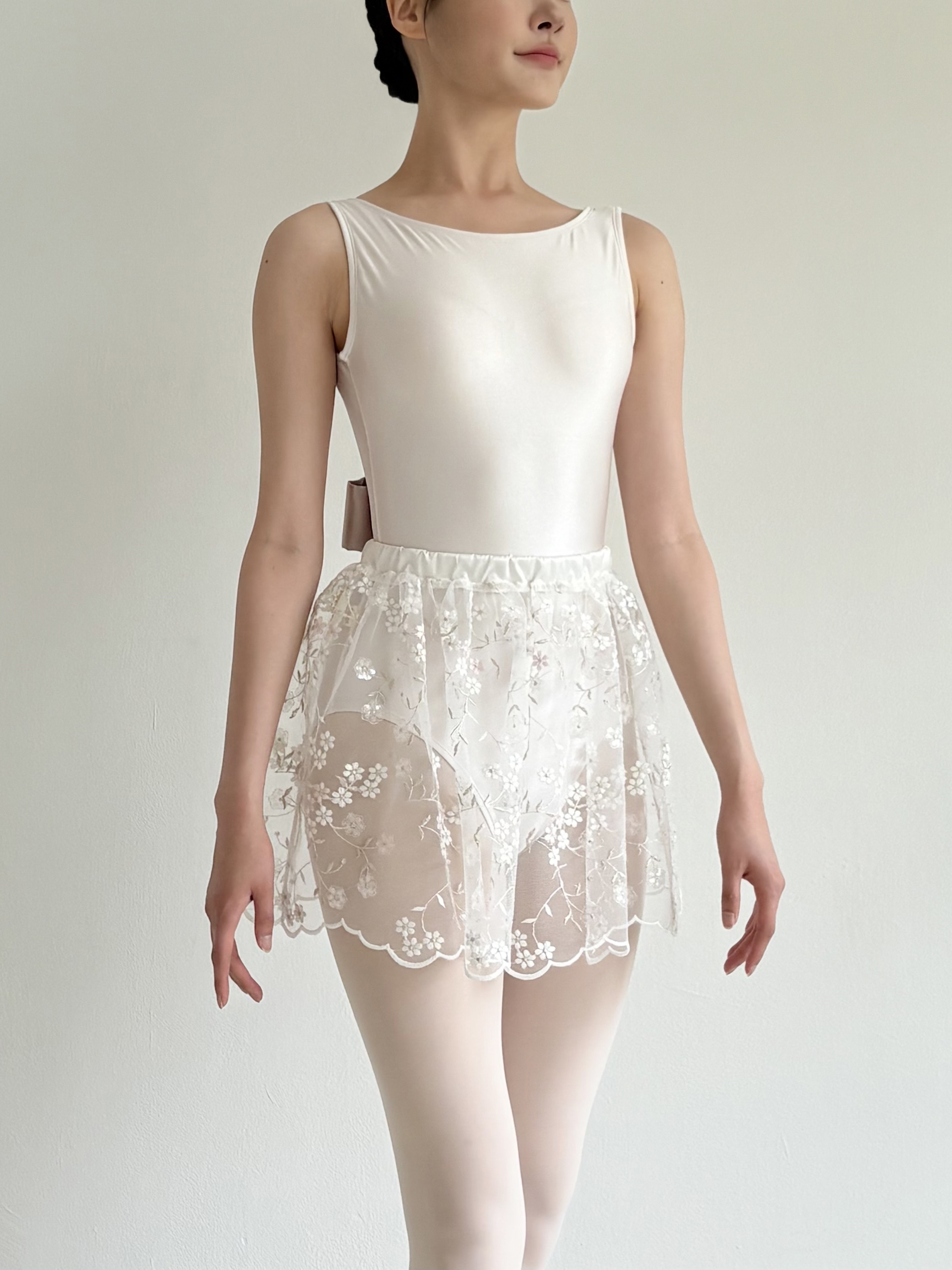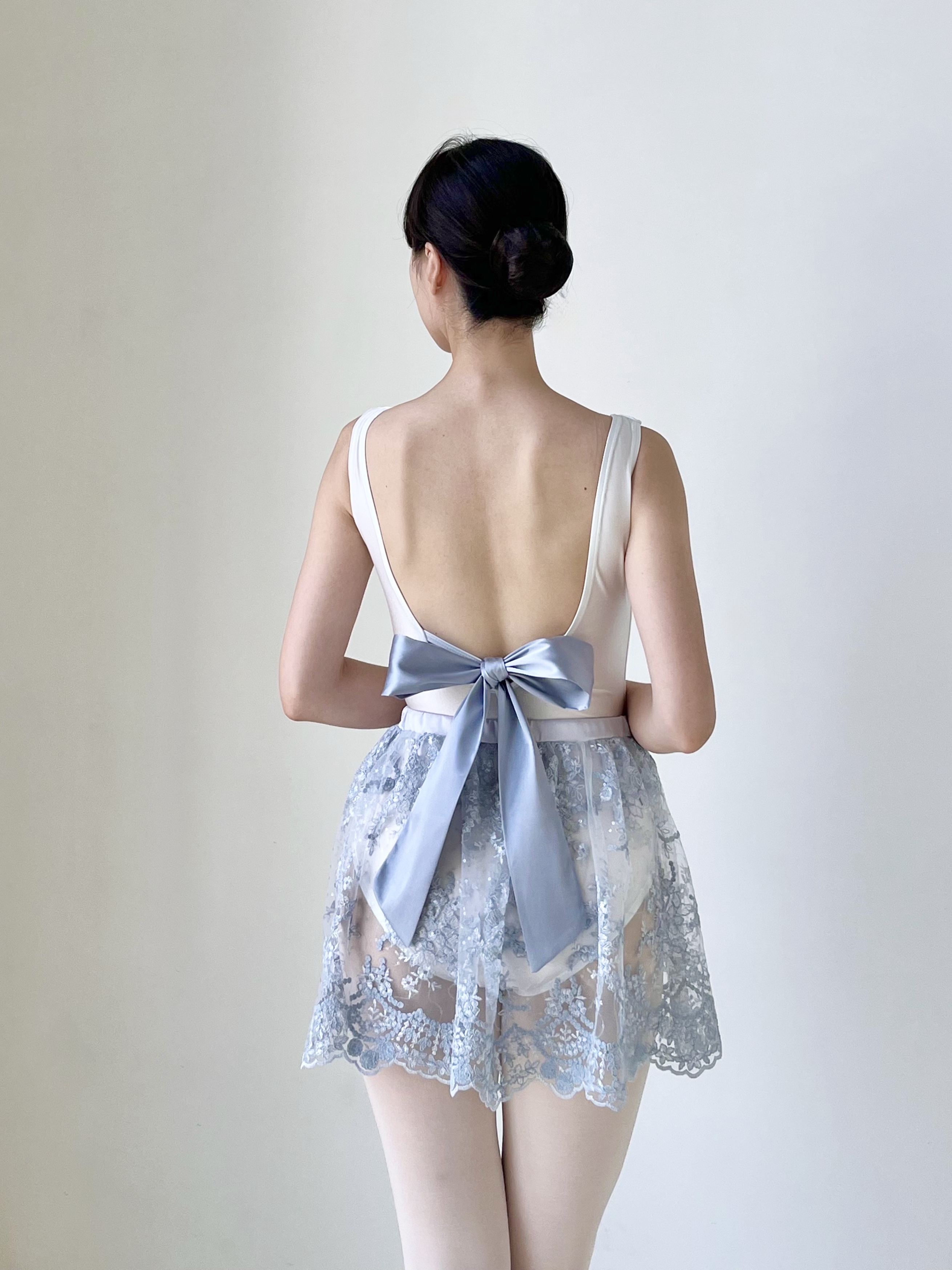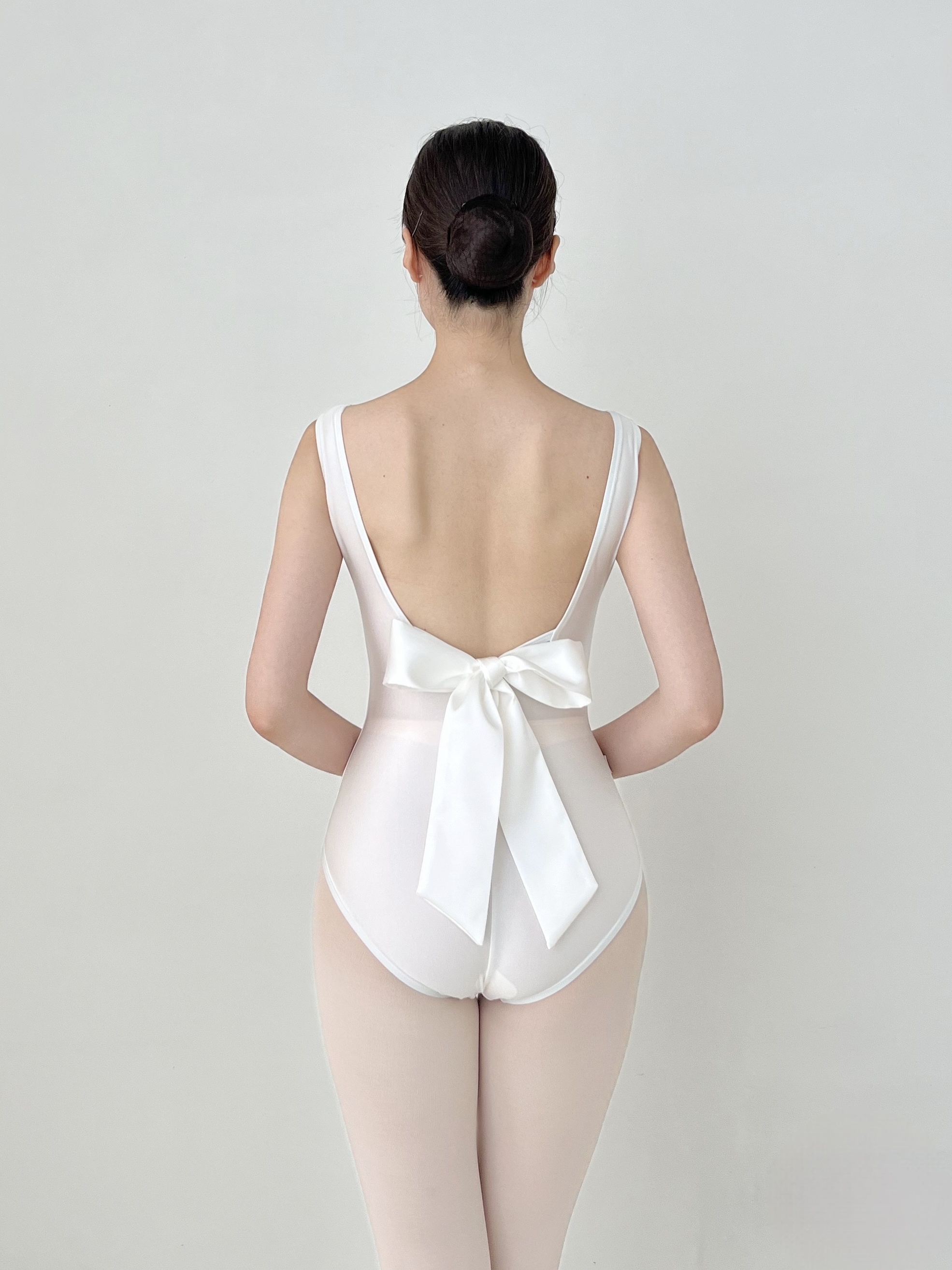 26 리뉴얼 에디션 Back ribbon leotard는 착용감과 핏에 중점을 두어 새롭게 리뉴얼되었습니다. 기존 버전보다 허리 길이를 2cm 늘려 착용 시 어깨에 가해지는 부담을 줄이도록 했습니다. 암홀 라인을 더 높게 설계해 겨드랑이 부분을 안정감 있게 감싸주며 편안하게 착용할 수 있습니다. 타이트한 원단 특성상 다른 레오타드보다 더 탄탄하고 구조감 있게 느껴질 수 있습니다. Dégagé, Back ribbon leotard _Pearl white 진주를 떠올리게 하는 맑은 화이트 컬러의 레오타드입니다. 은은한 펄감이 있는 원단으로 제작되어 매끈해 보이는 바디 라인을 연출해 줍니다. 보트넥 라인이 겨드랑이와 가슴 부분을 안정감 있게 받쳐주어 체형에 관계없이 편안하게 착용할 수 있습니다. 가슴 패드가 포함되어 있으며, 포켓형 디자인으로 삽입과 분리가 가능합니다. 등 부분에는 발레 슈즈에서 영감을 받은 X자 스트랩과 탈부착 가능한 리본이 더해졌습니다. 등 라인은 적당히 깊게 파여 있어 타이츠의 허리 밴드가 보이지 않으면서도 실루엣을 매끈하게 정리해 줍니다. 짧은 거싯과 어깨를 아래로 끌어내리는 세미 하이레그 디자인으로, 몸에 밀착되는 타이트한 레오타드를 선호하시는 분들께 추천합니다. *레오타드와 같은 색상의 리본이 기본 포함되며, 다른 색상의 리본은 별도 구매하실 수 있습니다. *생산 배치에 따라 리본의 두께와 스티치에 약간의 차이가 있을 수 있습니다. *소재 Nylon 82% Polyurethane 18% *세탁 방법 찬물 또는 미지근한 물에 단독 손세탁해 주세요.
