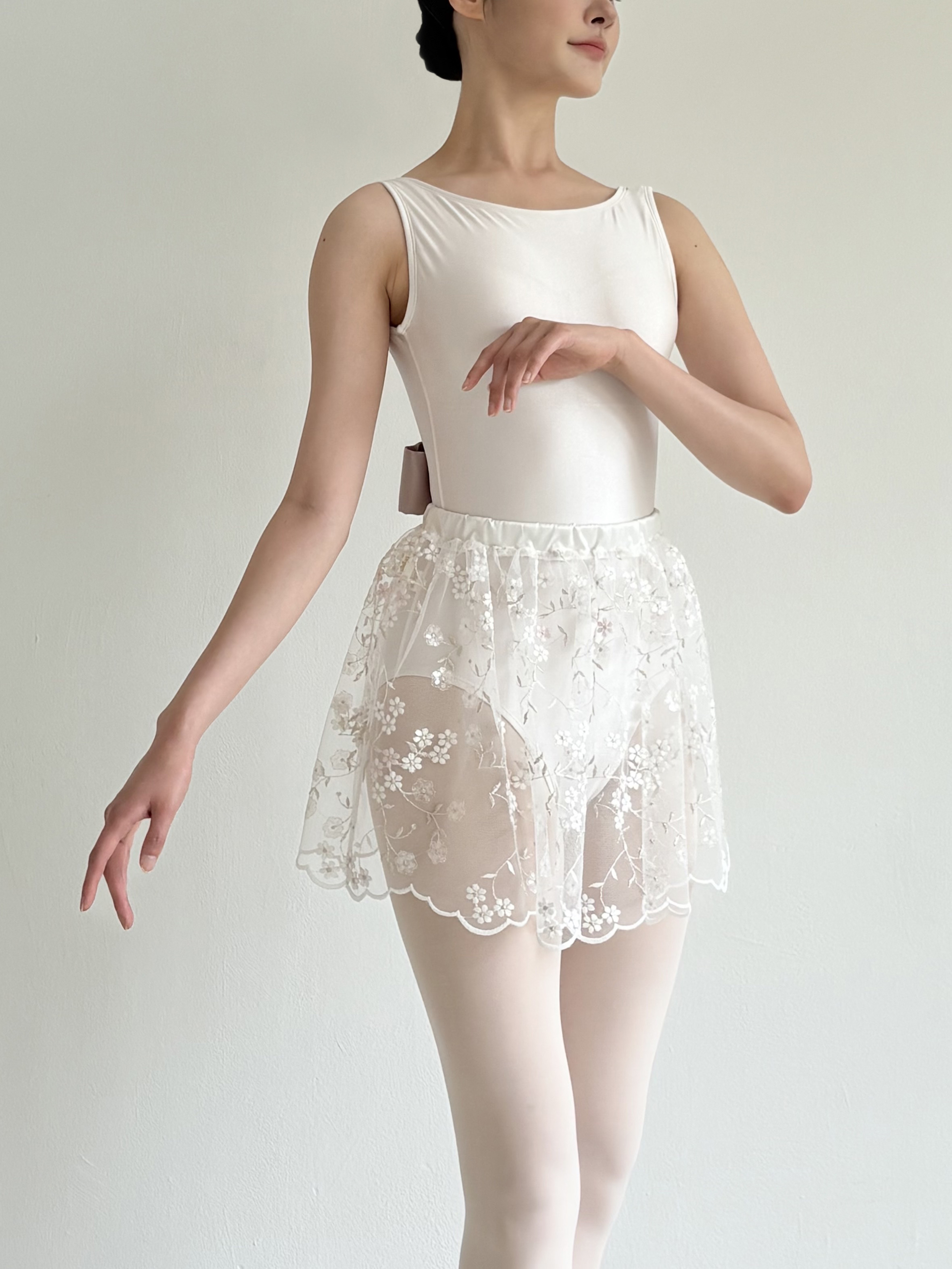 Dégagé, Bouquet 스커트 Dégagé Couture 라인의 Bouquet 스커트를 짧은 기장으로 선보입니다. 프리미엄 레이스와 웨딩드레스 원단으로 제작한 발레 스커트입니다. 자수 패턴은 작은 꽃송이들로 이루어져 있어 브라이덜 부케를 떠올리게 합니다. 화이트, 화이트 실버, 베이비 핑크 자수와 투명한 스팽글이 은은한 반짝임을 더합니다. 탄탄한 허리밴드는 새틴으로 마감해 편안하면서도 안정감 있게 착용할 수 있습니다. *사이즈 허리 62–70 cm 총장 37 cm 소재와 측정 방법에 따라 1–3 cm 정도 차이가 있을 수 있습니다. *소재 폴리에스터 100% *세탁 방법 찬물 또는 미지근한 물에 단독 손세탁하세요.