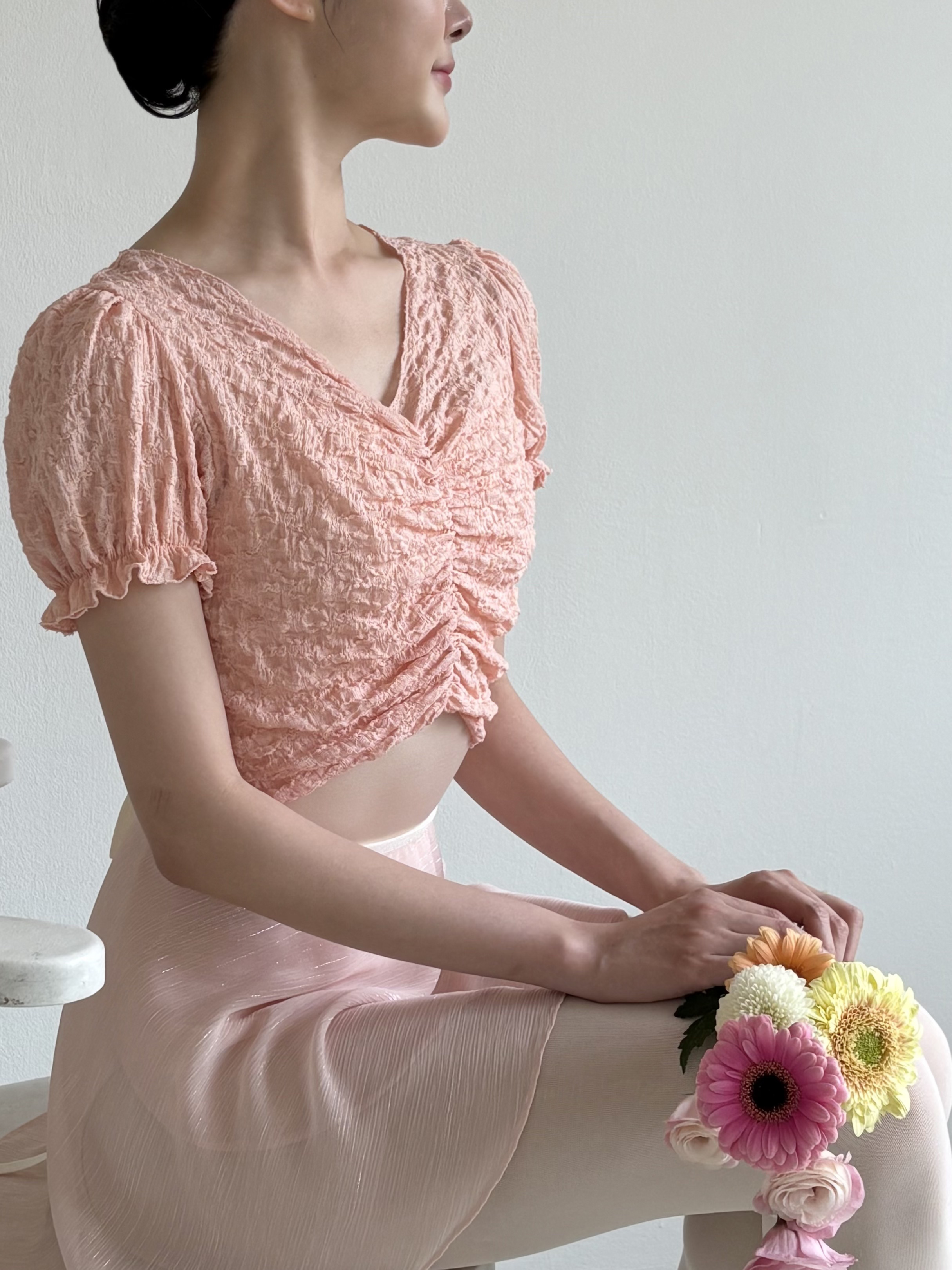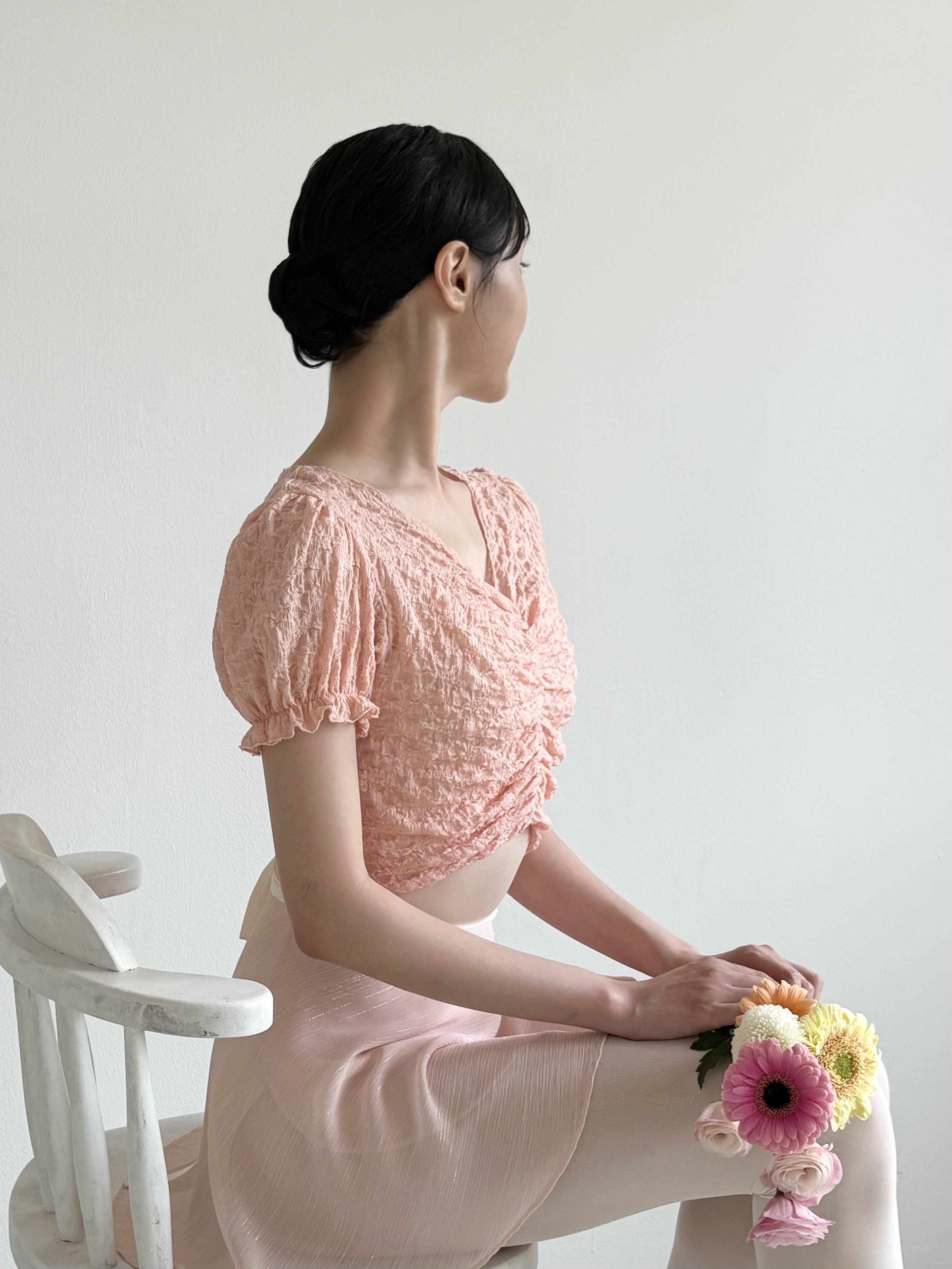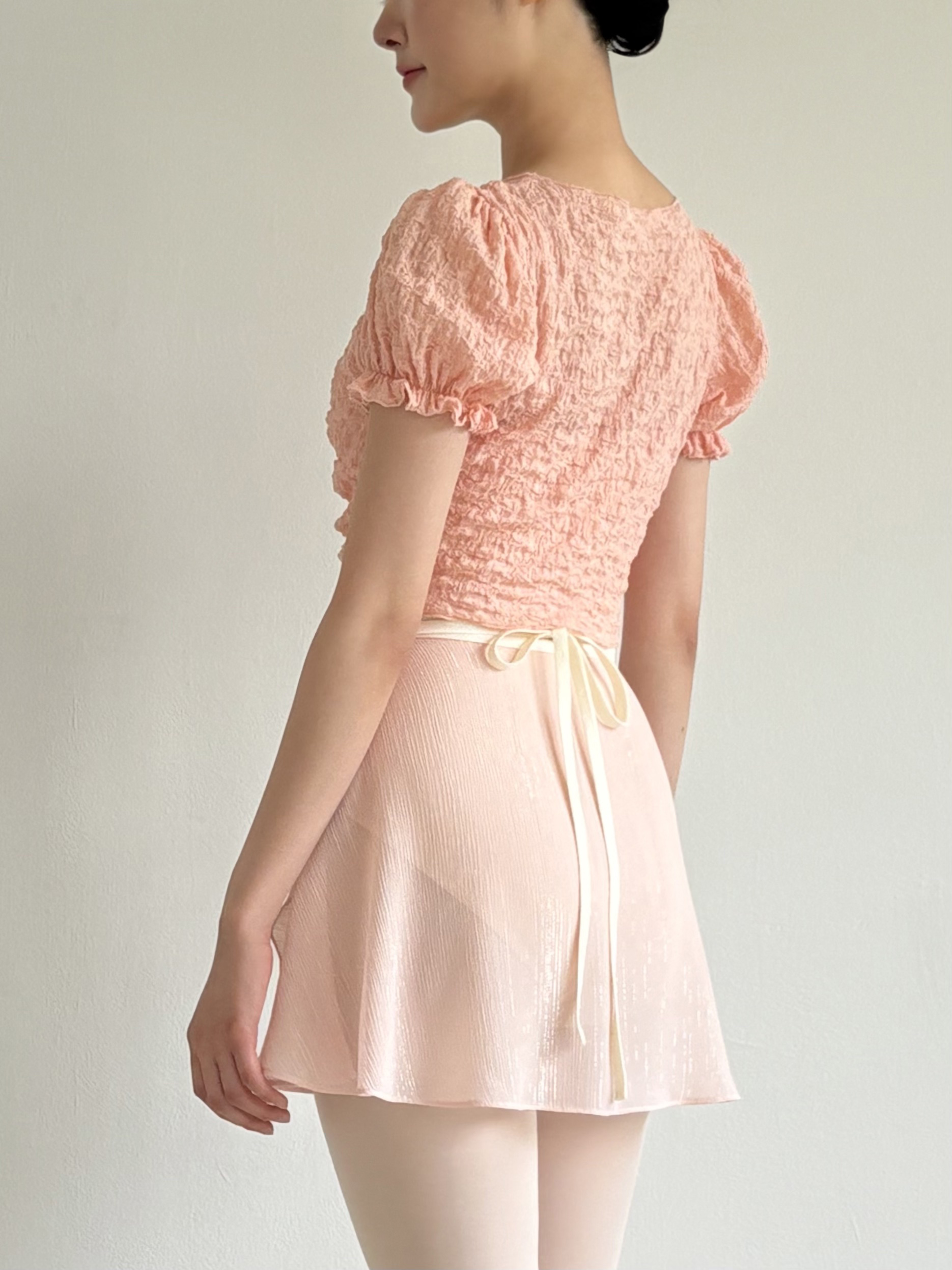 Dégagé, 퍼프 워머 _ Peach pink 이 퍼프 워머는 오랜 시간에 걸쳐 정성스럽게 개발되었습니다. 이번 시즌 가장 잘 어울리는 아이템으로, Dégagé가 자신 있게 추천합니다. 이 워머의 가장 큰 장점은 발레 클래스에서의 워밍업 아이템으로만이 아니라, 일상에서는 데일리 크롭 블라우스로도 활용할 수 있다는 점입니다. 가볍게 걸치기만 해도 힘들이지 않은 사랑스러운 분위기를 연출해 줍니다. Pure White, Peach Pink, Sky Blue 세 가지 컬러로 구성되어 있으며, 보기만 해도 기분이 밝아지는 색감으로 선택했습니다. 세 가지 모두 밝은 톤이지만 피부 톤을 부드럽게 살려주어 안색을 한층 더 화사하게 보이게 해줍니다. 볼륨감 있는 퍼프 소매와 앞중심 셔링 디테일이 매력을 더해주고, 깊은 V넥 라인이 상체가 부해 보이지 않도록 잡아줍니다. 앞기장은 짧게 디자인되어 허리와 복부가 더욱 슬림해 보이도록 했습니다. 사랑스러운 디자인이지만, 착용했을 때 실루엣은 깔끔하게 떨어집니다. 부드럽고 신축성이 뛰어난 원단으로 제작되어, 발레 클래스에서도 답답함 없이 편안하게 착용할 수 있고, 가볍고 유연한 착용감 덕분에 데일리 아이템으로도 자주 손이 가는 제품입니다. 요즘은 발레 후 레오타드 위에 바로 걸치고 집으로 돌아오곤 합니다. 기분이 조금 가라앉는 날에는 컬러감 있는 퍼프 워머를 입는 것만으로도 비타민을 챙겨 먹는 듯한 기분이 듭니다. 실용성과 감성을 모두 담은 이 퍼프 워머와 함께 일상과 발레 시간을 더욱 행복하게 만들어 보세요. *사이즈 가슴 40cm 총장(뒷중심) 37cm 소매길이 21cm 소재와 측정 방법에 따라 1–3cm 정도 차이가 있을 수 있습니다. *소재 Cotton 75% Nylon 20% Span 5% *세탁 방법 찬물 또는 미지근한 물에 단독 손세탁해 주세요. 탈수기나 건조기 사용은 피해주세요(수축될 수 있습니다). *
