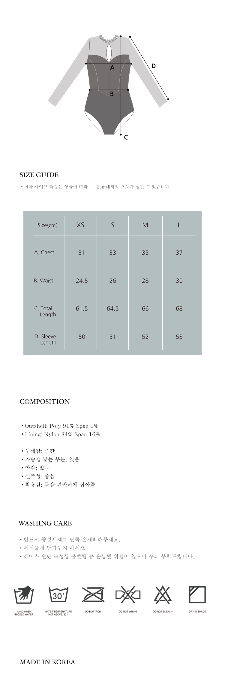 블랙 레이스와 누드 톤의 조합이 아름다운 레오타드입니다. 홀터 네크라인은 레이스로 포인트를 주었고, 소매는 신축성 있는 메쉬 소재로 제작되어 불편함 없이 더욱 우아한 움직임을 완성합니다. 이 레오타드는 스포츠 브라 패드를 넣을 수 있는 인서트를 제공합니다. • 겉감: NYLON 83 SPAN 17% • 안감: NYLON 87% SPAN 13%