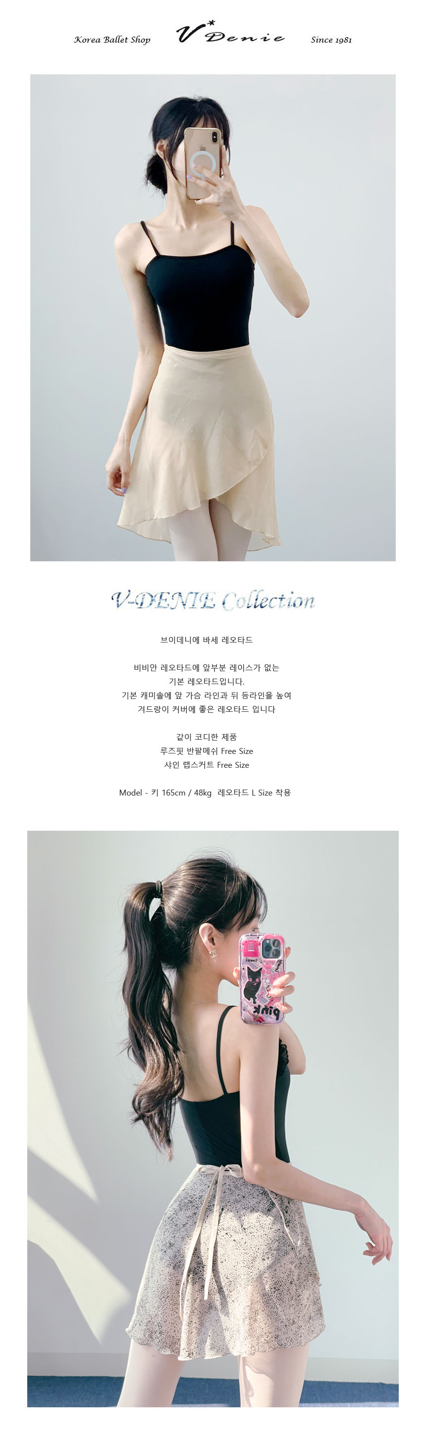 브이데니에 바세 레오타드 비비안 레오타드에 앞부분 레이스가 없는 기본 레오타드입니다. 기본 레미솝에 앞 가슴 라인과 뒤 등라인을 높여 겨드랑이 커버에 좋은 레오타드 입니다 같이 코디한 제품 루즈핏 반팔메쉬 Free Size 샤인 랩스커트 Free Size Model - 키 165cm / 48kg 레오타드 L Size 착용