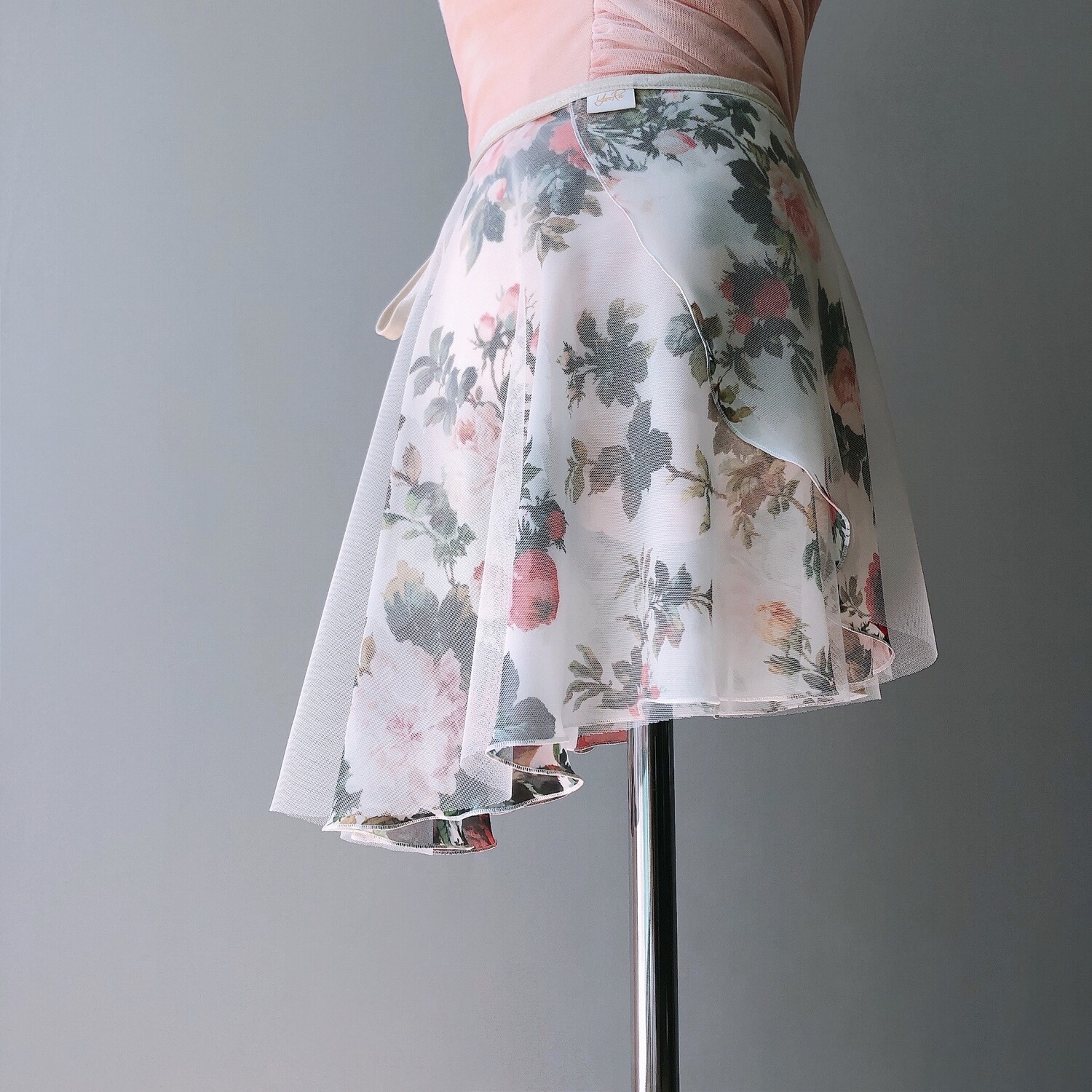 부드러운 아이보리 튤이 크림색 장미 프린트 쉬폰 위에 은은하게 레이어드된 양면 착용 스커트입니다.
