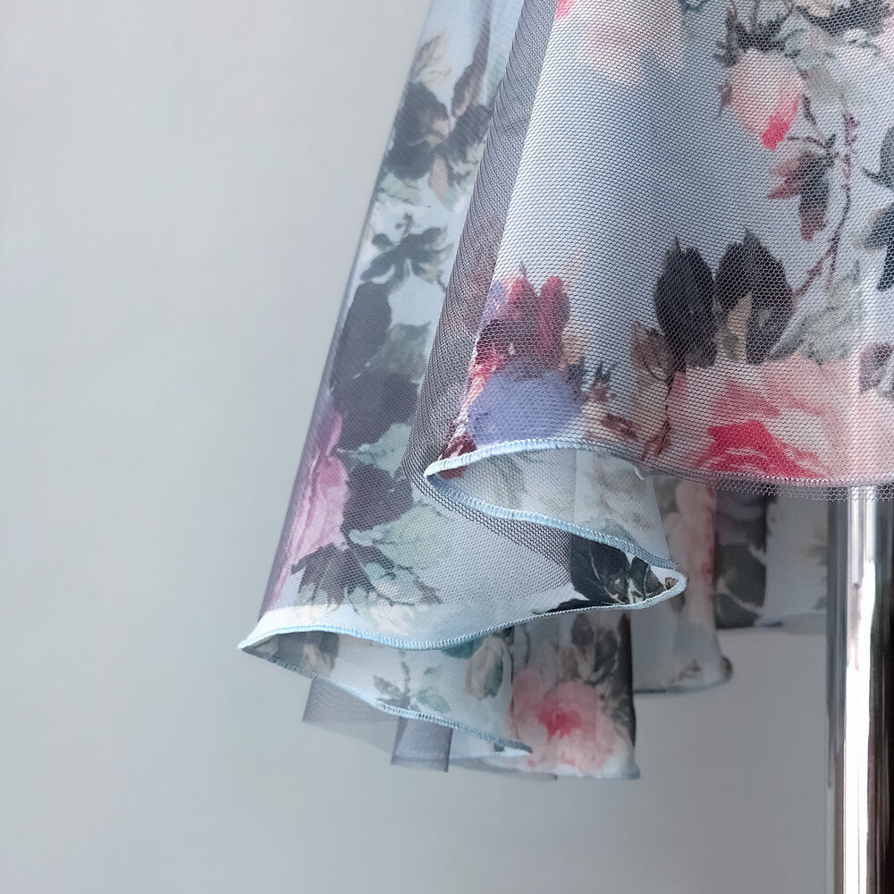 부드러운 블루그레이 튤 레이어가 파스텔 블루 장미 프린트 쉬폰 위에 은은하게 드리워진 리버서블 스커트입니다.