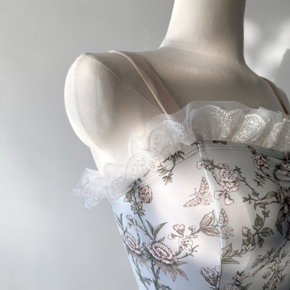 영국 정원의 분위기에서 영감을 받은 우아하고 세련된 플로럴 프린트와 섬세하고 부드러운 더블 레이스가 어우러져, 마치 예술 작품 같은 느낌을 주는 레오타드입니다.