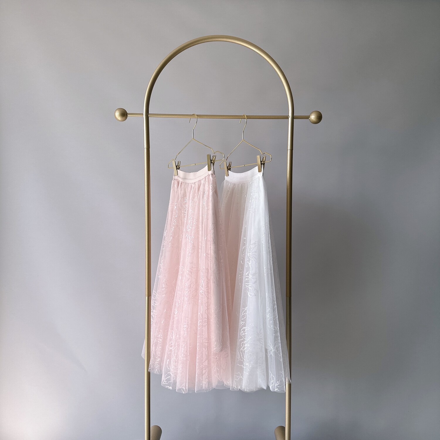우아한 디자인의 장미꽃 자수가 놓인 튤 스커트입니다. 빛의 각도에 따라 은은하게 반짝이는 작은 투명 스팽글이 섬세하게 배치되어 고급스러운 분위기와 아름다운 포인트를 더해줍니다.
