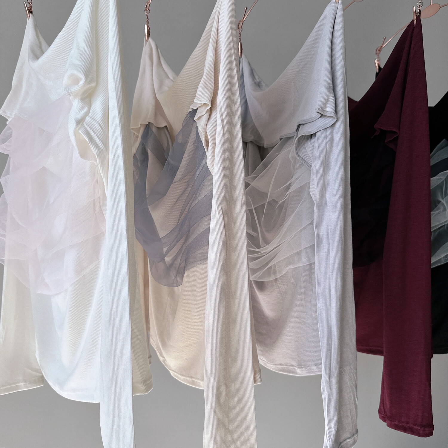 우아하게 드레이프된 네크라인과 가슴 부분의 화이트 쉬폰 셔링이 백조를 연상시킵니다.